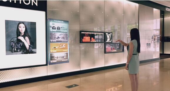 互動櫥窗設(shè)備可將圖像投射到商戶臨街玻璃櫥窗的普通玻璃上(所有互動櫥窗設(shè)備都放置在店內(nèi),畫面尺寸不限),顧客在店外隔著玻璃點(diǎn)擊圖像畫面,在店內(nèi)的互動櫥窗設(shè)備可感應(yīng)到 ……